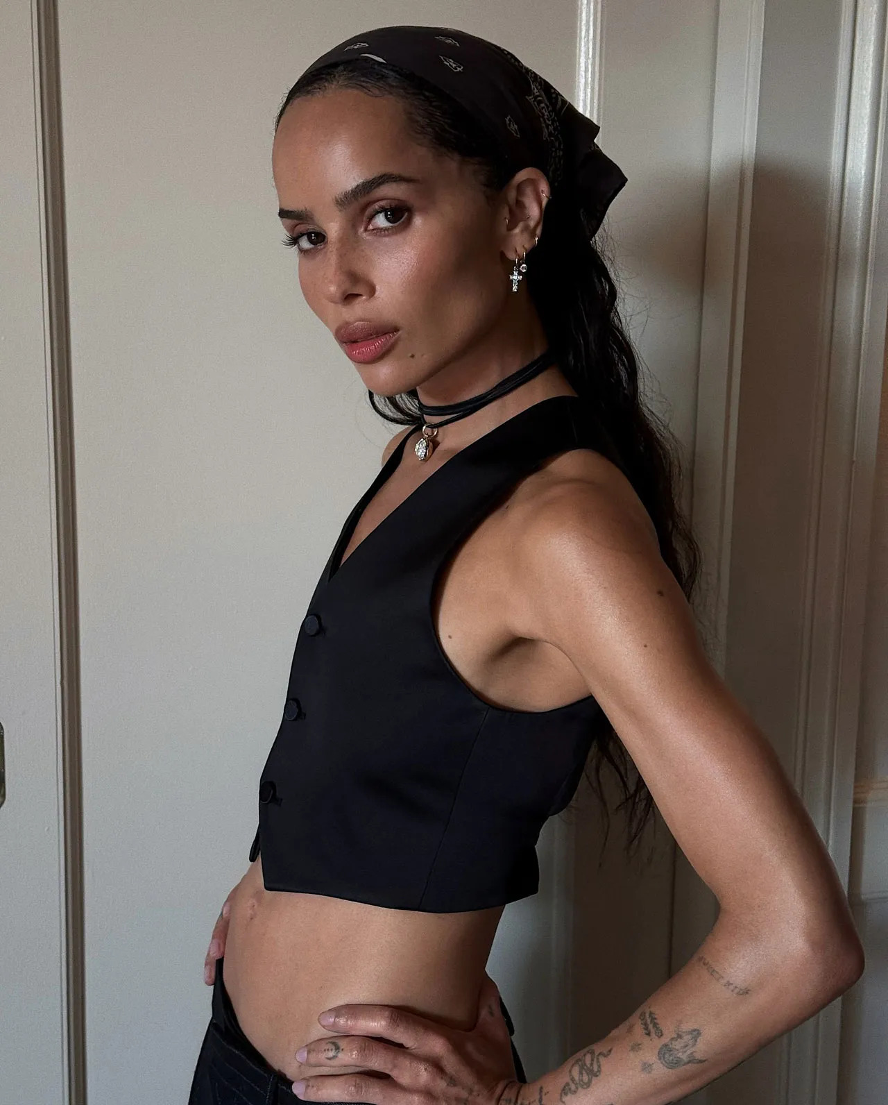 في نيويورك، ظهرت Zoë Kravitz في برنامج Late Night with Seth Meyers بإطلالة لافتة اعتمدت فيها صيحة البندانا (Bandana). فقد اختارت ربط الوشاح خلف الأذنين مع شعر مموج بتسريحة طبيعية تحمل بعض العفوية، مما منحها لمسة بوهيمية أنيقة تذكر بروح التسعينيات، إلا أن أسلوبها جاء متجددًا ليُلهم صيحات الشعر في 2025.