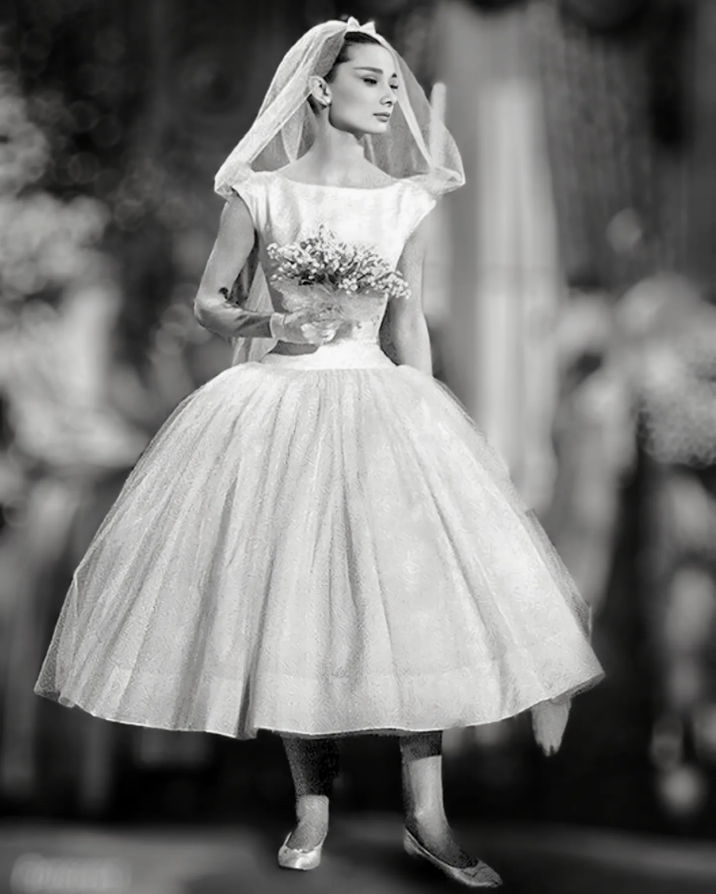 بدأت شعبية فساتين الـ Drop Waist في خمسينيات القرن الماضي، لكنها ارتبطت بشكل لافت بأيقونة السينما Audrey Hepburn عام 1957، عندما ظهرت في فيلم Funny Face بفستان من تصميم دار Givenchy. جمع التصميم بين الفخامة والبساطة، إذ نُفّذ من أقمشة الساتان والحرير، مع طبقات متعددة من التول في التنورة. بدأ الخصر منخفضًا بشكل تدريجي قبل أن يتسع إلى تنورة واسعة بأسلوب A-Line، ما منح الفستان مظهرًا أنيقًا بلمسة راقية. شكّل هذا التصميم نقطة تحوّل نحو مزيد من الجرأة والتنوّع في فساتين الزفاف، ليبقى واحدًا من أبرز الإطلالات الأيقونية في تاريخ الموضة.
