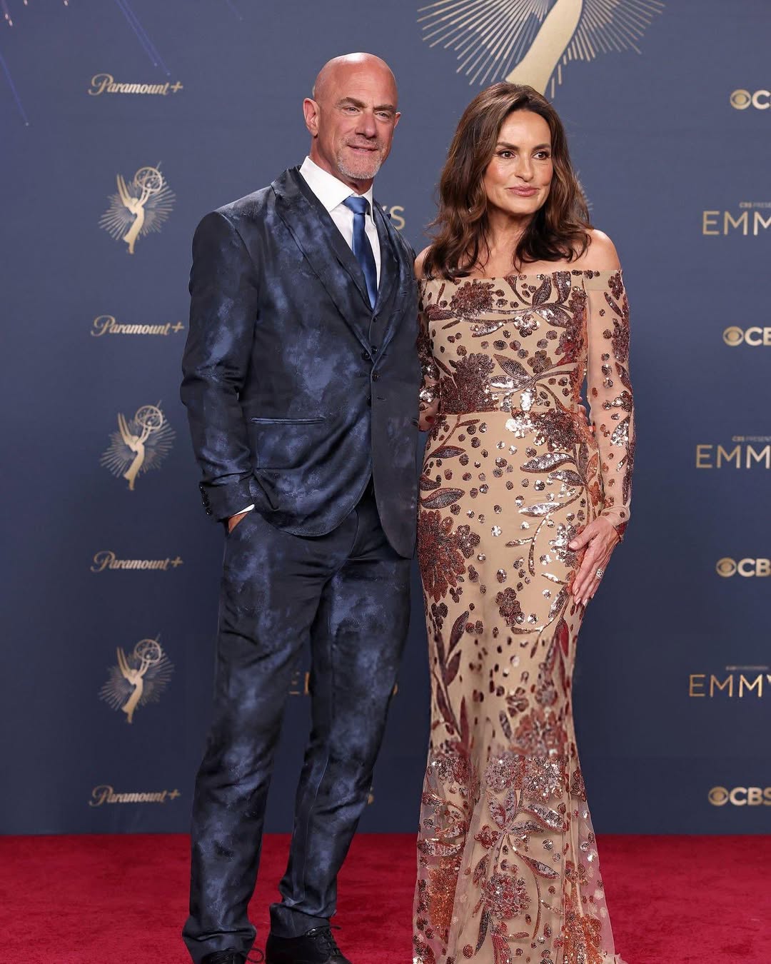تألقت Mariska Hargitay بفستان أنيق من توقيع Elie Saab باللون النيود، مزيّن بتطريزات برغندية وبرونزية لامعة. الفستان جاء بقصّة ضيّقة مع أكمام طويلة ، فيما أضفى تصميم الأوف شولدر لمسة أنثوية راقية وناعمة على حضورها.