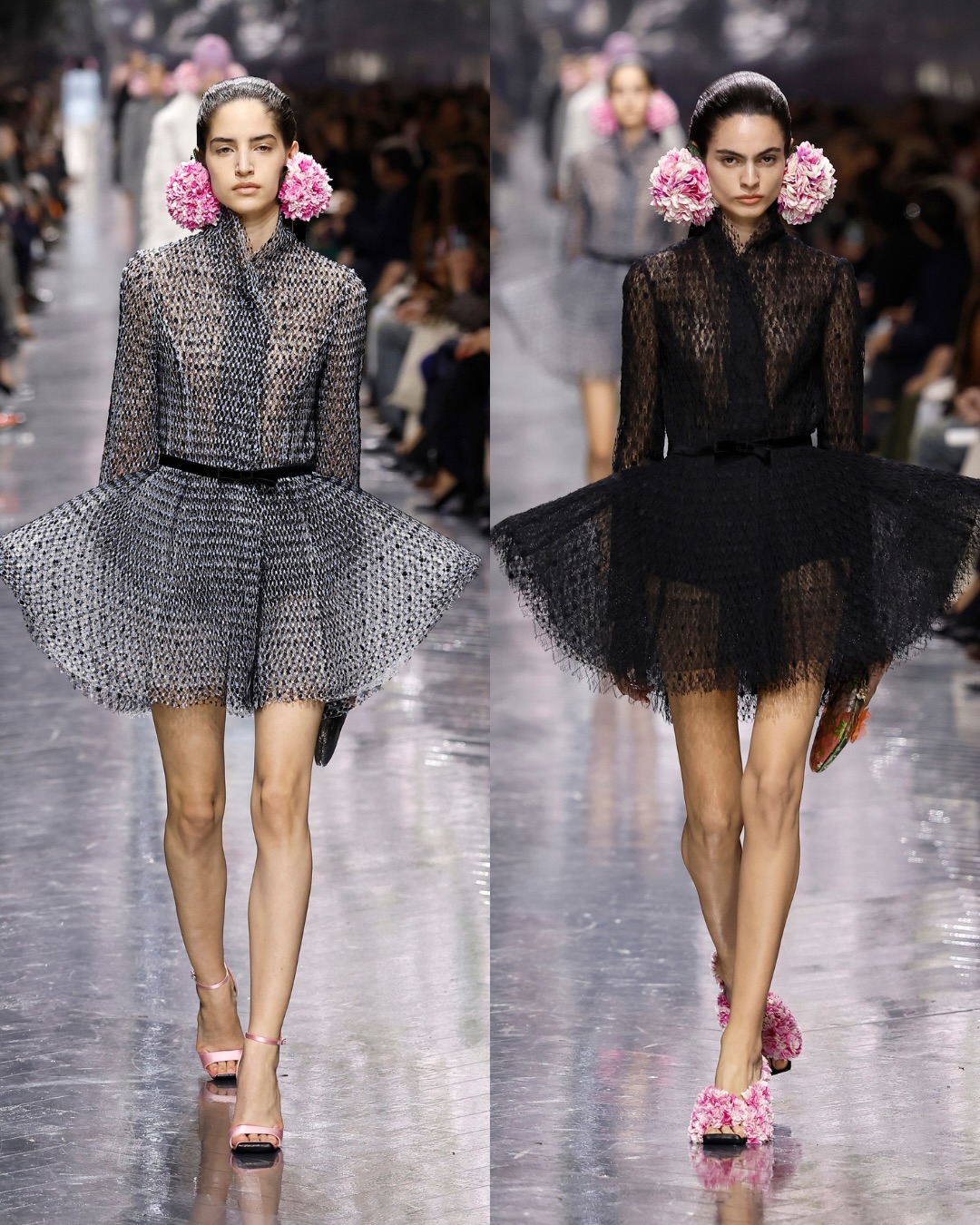 فيما تتميّز أخرى بتفاصيل مستوحاة من أسلوب الخداع البصري Trompe-l’œil، وبتلات حريرية وميداليات زخرفية. كما تستحضر بعض التصاميم مراجع أرشيفية من أعمال Roger Vivier صُمّمت خصيصًا للدار