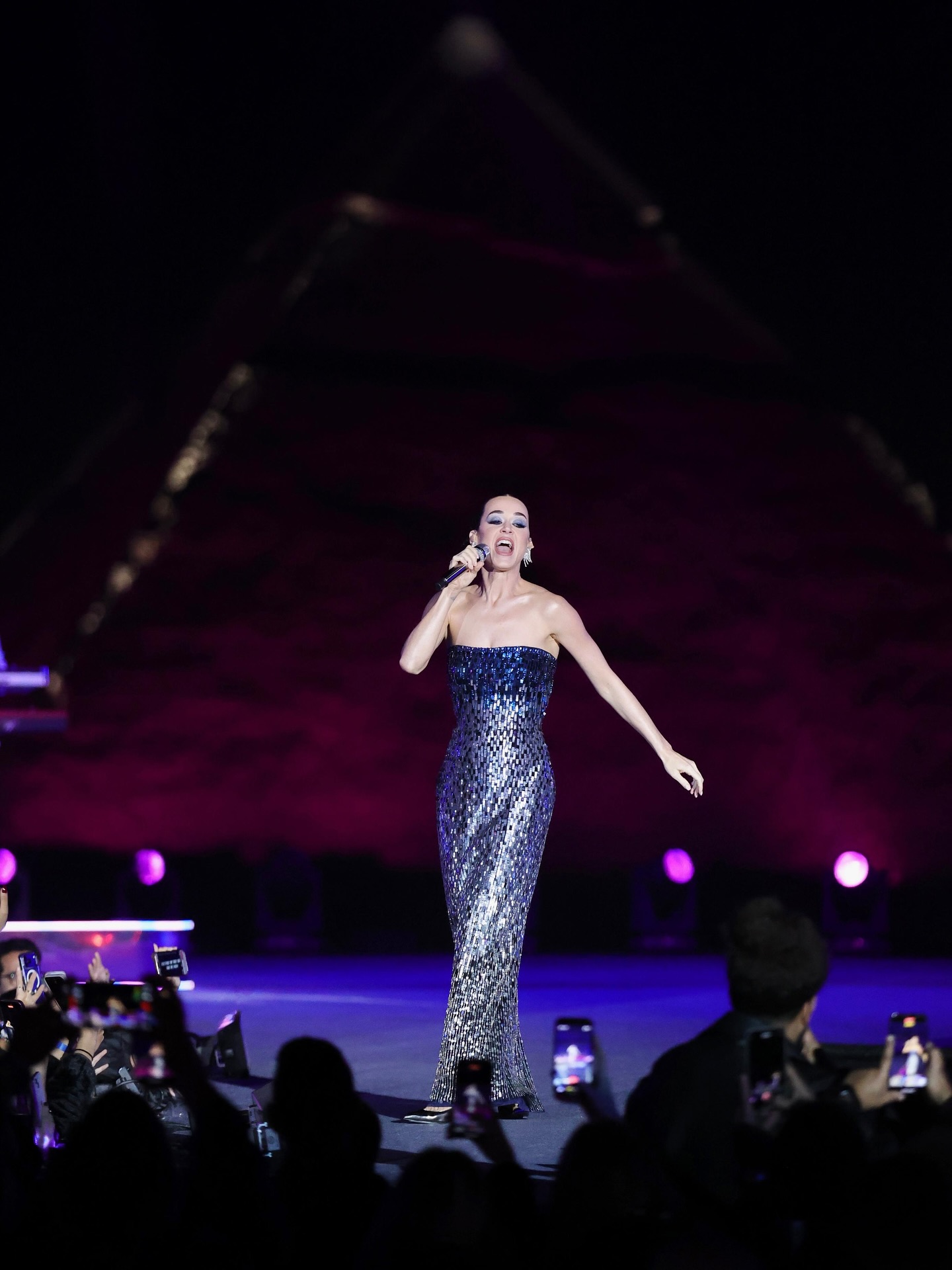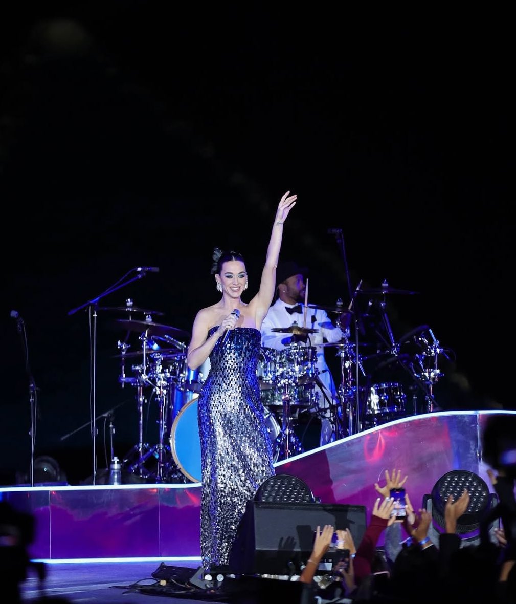 وخَطفت كاتي بيري الأنظار بإطلالة لامعة حملت توقيع دار Jenny Packham، حيث اختارت فستان Lucille Maxi المصمّم بقصّة ضيّقة من دون حمالات، والمزيّن بزخارف مترفة من الكريستال والترتر بمزيج براق من الأزرق والفضي. الفستان منح النجمة حضورًا استثنائيًا يليق بالموقع الأثري خلفها.
