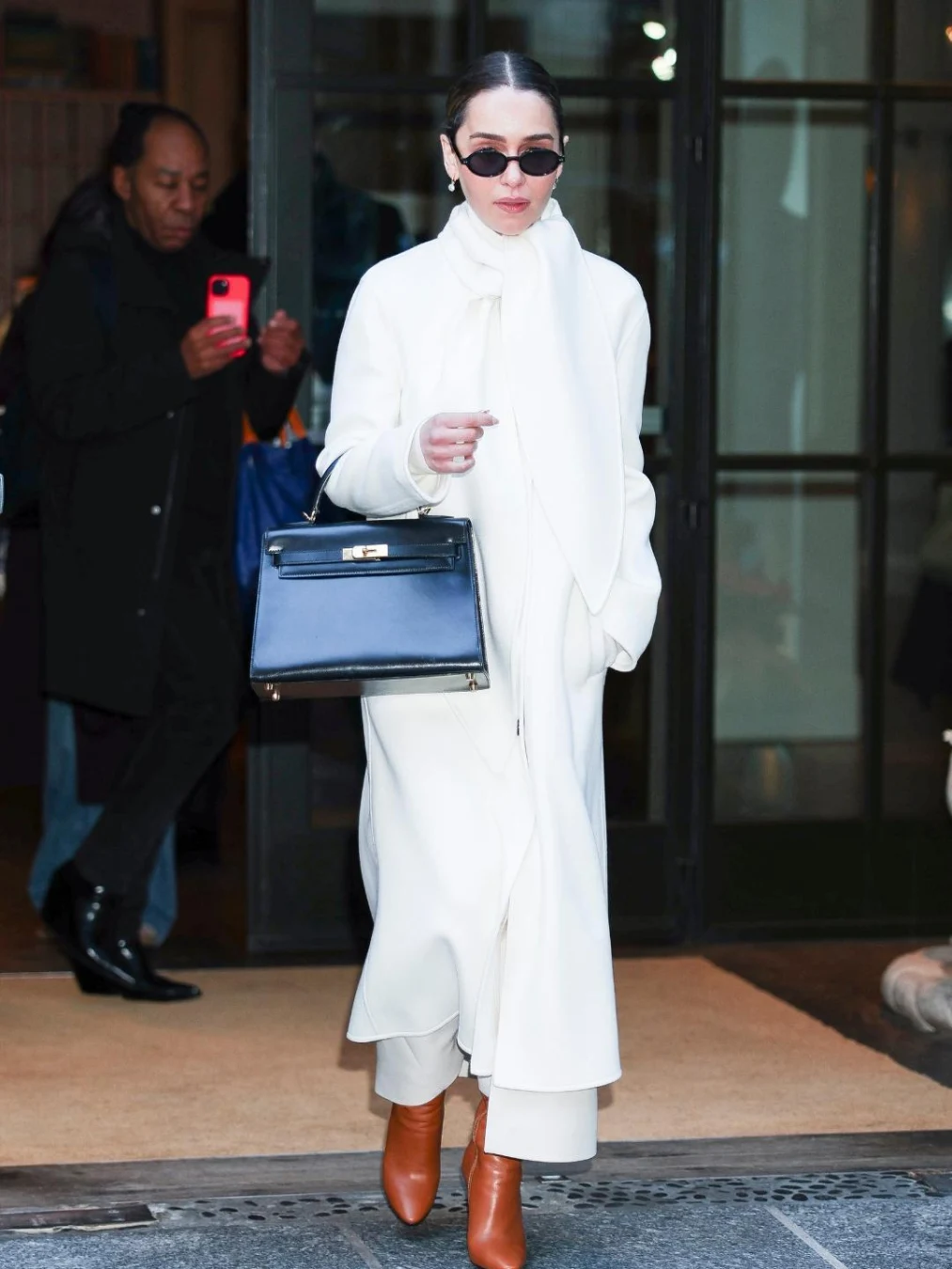في شوارع سوهو بنيويورك، قدّمت Emilia Clarke نموذجًا متكاملًا للأناقة الشتوية العصرية، جمعت فيه بين الفخامة والراحة العملية. اعتمدت على بوتس Saint Laurent Koller باللون الكاملي بطول الركبة وكعب سميك، شكل نقطة تركيز لونية على خلفية الإطلالة البيضاء. نسّقت البوتس مع معطف كشمير من Loro Piana وتنورة وفستان من Lisa Yang Collection و Ruthie، وأضافت لمسة نهائية راقية من خلال حقيبة Hermès Kelly السوداء ونظارات شمسية بيضاوية، لتجسّد مفهوم الأناقة اليومية الهادئة والفاخرة في آن واحد.