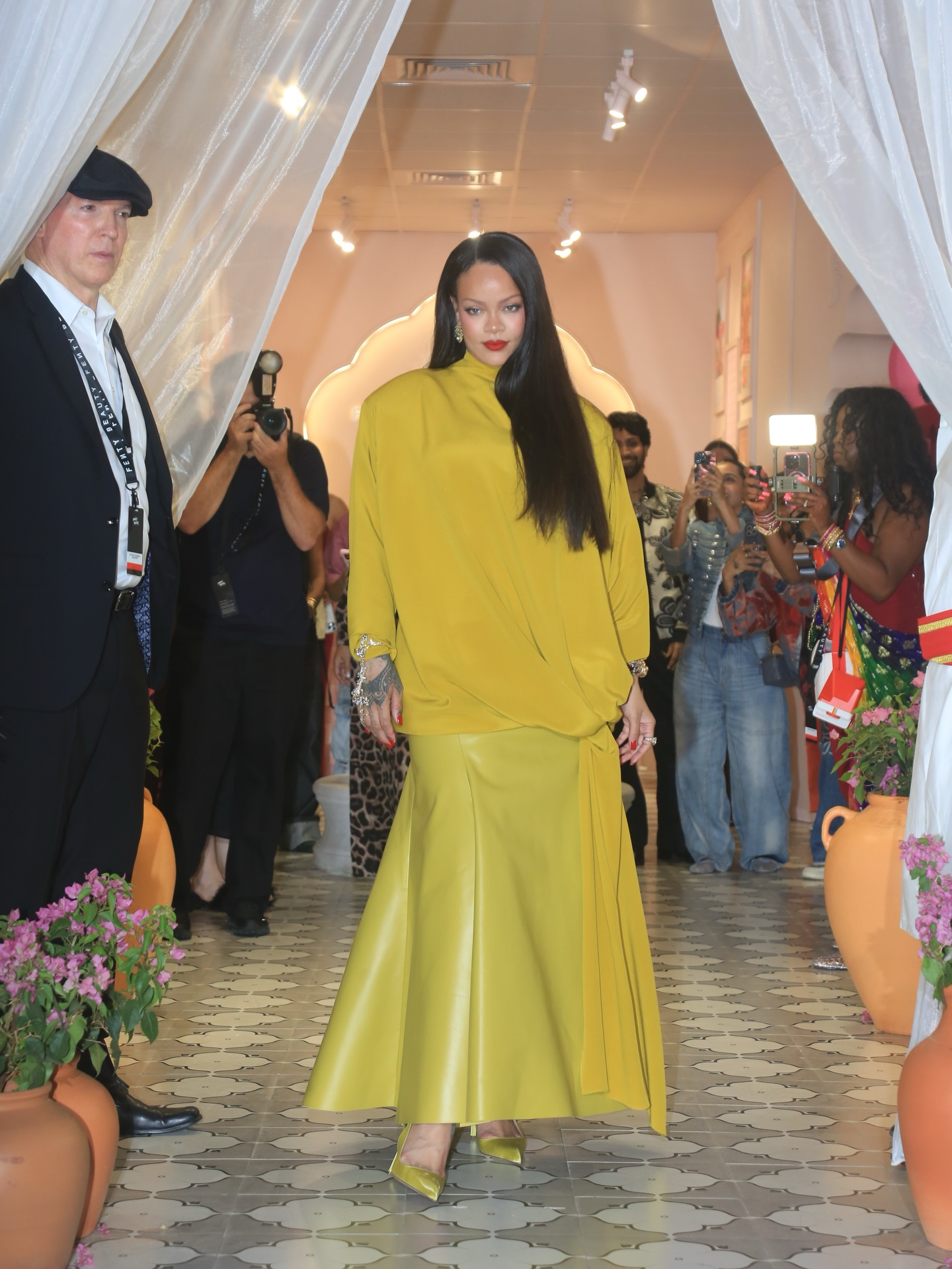 لفتت النجمة العالمية Rihanna الأنظار بإطلالة جريئة باللون الأصفر خلال ظهورها في مدينة Mumbai، حيث ارتدت تصميماً مخصصاً من دار Mugler تميز بدرجة صفراء قوية وقصة عصرية لافتة تعكس أسلوب الدار المعروف بالتصاميم الجريئة والبنية الهندسية الواضحة. وقد جاءت الإطلالة بتفاصيل أنيقة أبرزت حضورها الواثق، لتؤكد مرة أخرى قدرتها على تحويل الألوان الجريئة إلى بيان موضة مؤثر يعكس شخصيتها المميزة في عالم الأزياء.