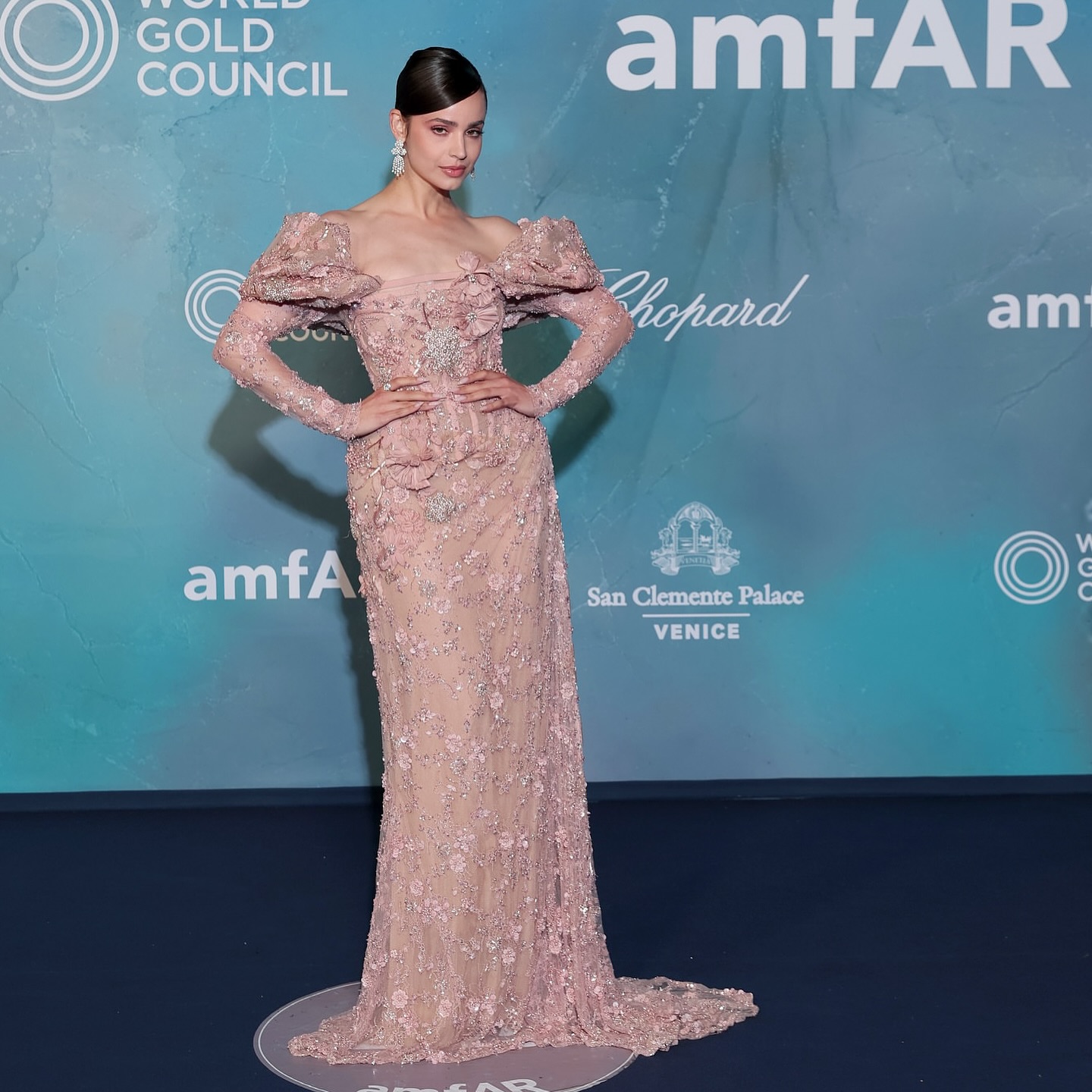 حضرت Sofia Carson حفل amfAR Gala Venezia 2025 بفستان طويل باللون النيود من توقيع Elie Saab. وبالإضافة إلى ذلك، نسّقت إطلالتها مع مجوهرات فاخرة من Chopard. لذلك بدت في غاية الأناقة، مع لمسة كلاسيكية راقية أكملت حضورها على السجادة الحمراء.
