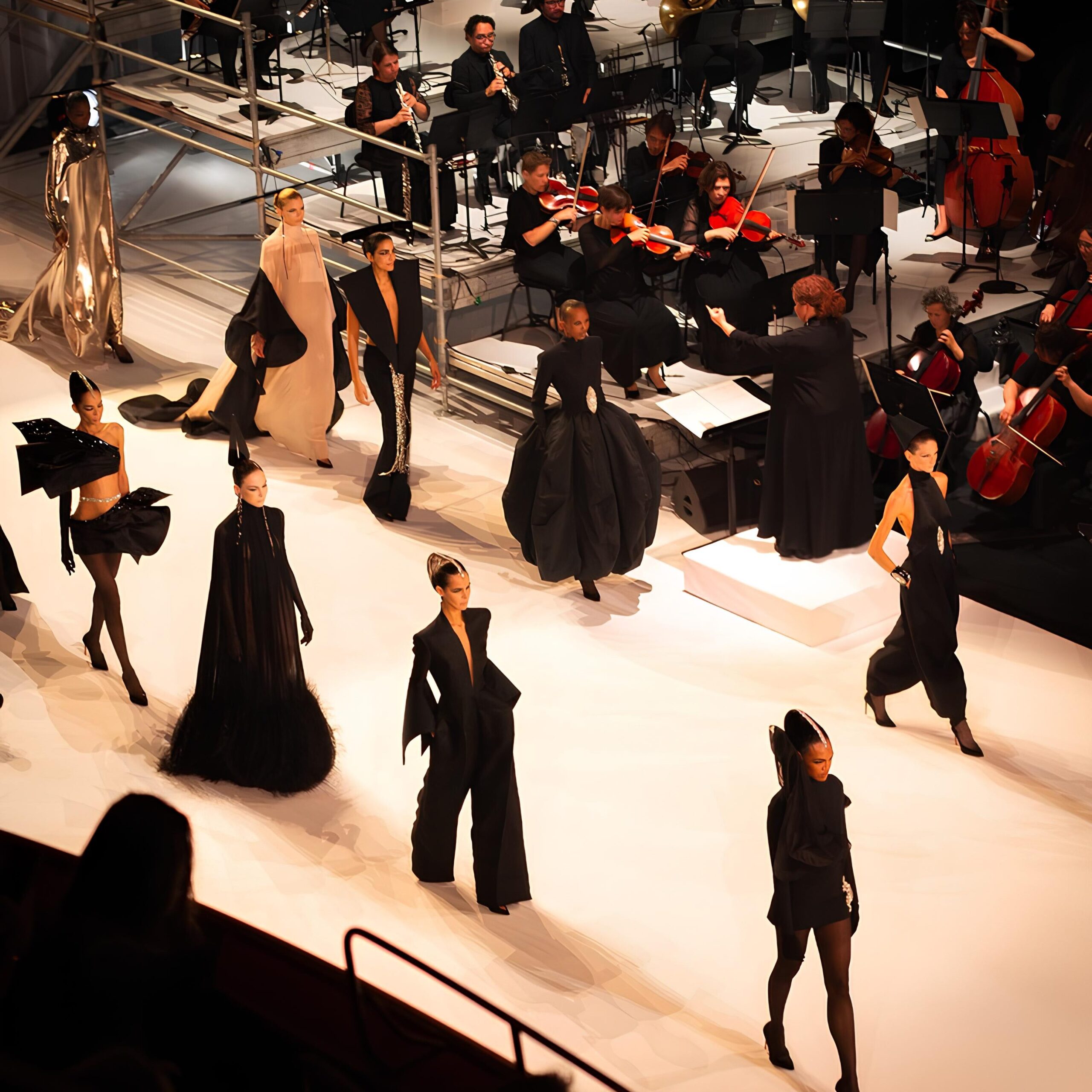 ومن هذا التوافق الفني، وُلد تعاون فريد من نوعه. كانت نتيجته عرض أزياء مبهر، ترافقه موسيقى حية عزفها 52 موسيقيًا مباشرة على المسرح.
