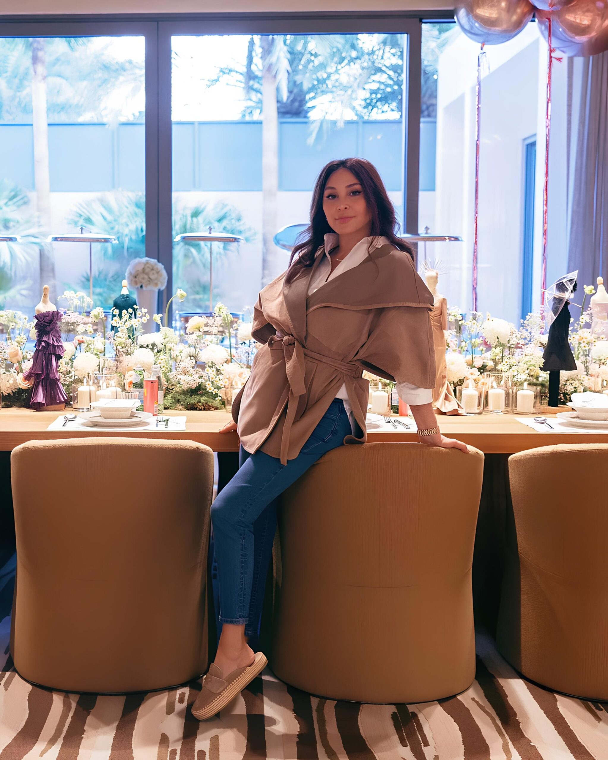 خطفت مايا دياب الأنظار بإطلالة تجمع بين الجرأة والطابع المستقبلي. ارتدت توب بلون النيود بقماش خفيف وواسع مع قبعة مزوّدة بحواف طويلة متدلّية، ما أضفى حركة وانسيابية ديناميكية على اللوك. اعتمدت جينزًا أبيض واسعًا وممزّقًا بطريقة تلفت النظر وتمنحه نفَسًا شبابيًا متمردًا. النظارات الشمسية العاكسة باللون البرتقالي المعدني فيما جاءت الإكسسوارات المعدنية العريضة لتؤكّد أسلوبها القوي والواثق. إطلالة مريحة، جريئة، وملفتة.